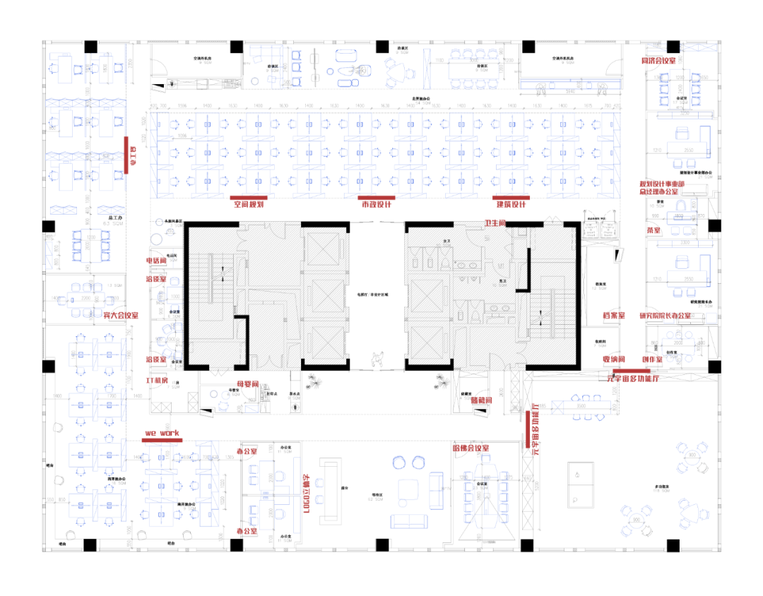 在空間規(guī)劃上,我們根據(jù)工作方式的特點,充分考慮功能與不同情境的活動需求,打造鼓勵與展示創(chuàng)意過程的空間氛圍。在這里,設計師們可以頭腦風暴、集思廣益、舌戰(zhàn)群儒;亦可以舉辦各種形式的研討與社交活動;還可作為規(guī)劃設計事業(yè)部對外展示與交流的窗口。