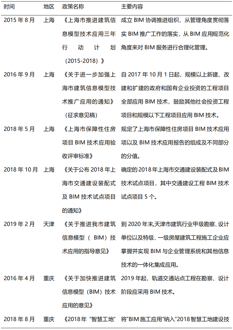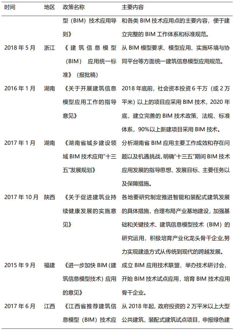 從2014年開(kāi)始,在住建部的大力推動(dòng)下,各省市政策相繼出臺(tái)BIM推廣應(yīng)用文件,到目前我國(guó)已初步形成BIM技術(shù)應(yīng)用標(biāo)準(zhǔn)和政策體系,為BIM的快速發(fā)展奠定了堅(jiān)實(shí)的基礎(chǔ)。2017年,貴州、江西、河南等省市正式出臺(tái)BIM推廣意見(jiàn),明確提出在省級(jí)范圍內(nèi)提出推廣BIM技術(shù)應(yīng)用。2018-2019年,各地政府對(duì)于BIM技術(shù)的重視程度不減,重慶、北京、吉林、深圳等多地政策出臺(tái)指導(dǎo)意見(jiàn),旨在推動(dòng)BIM技術(shù)進(jìn)一步應(yīng)用普及。隨著我國(guó)出臺(tái)BIM推廣意見(jiàn)的省市數(shù)量逐漸增多,全國(guó)BIM技術(shù)應(yīng)用推廣的范圍更加廣泛。表2列舉了部分重要地方鼓勵(lì)政策。