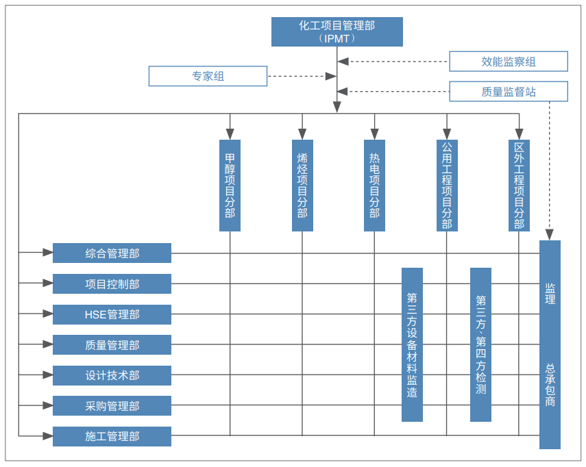 二是文件適用范圍。文件使用范圍包括PMC/IPMT團隊內(nèi)部管控;業(yè)主與項目管理公司接口協(xié)調(diào)與管控;管控EPC、監(jiān)理等各類參建單位;與政府主管部門協(xié)調(diào);覆蓋工程建設全過程(各階段、各專業(yè))5類。三是文件發(fā)布。項目管理體系文件由PMC編制,經(jīng)業(yè)主批準后發(fā)布;涉及管控EPC、監(jiān)理等參建單位的,應列入招/議標文件發(fā)布。四是文件的價值。迅速整合業(yè)主項目管理團隊(PMC/IPMT)的工作,使其管理有序、科學合理、專業(yè)透明;符合法律、法規(guī)和政府監(jiān)管要求,奠定工程建設有序推進基礎;業(yè)主管理文件(對項目執(zhí)行的具體要求)列入招/議標文件有利于承包商等投標人進行準確報價、作出承諾和響應,縮短中標后合同談判時間,業(yè)主管理文件成為合同附件(有法律約束力),將顯著減少合同糾紛。矩陣式管理結(jié)構(gòu),是常見的組織結(jié)構(gòu)形式之一。PMC/IPMT團隊即是業(yè)主方項目管理團隊,是工程建設的中樞指揮機構(gòu),其組織機構(gòu)的設計至關(guān)重要。項目的組織結(jié)構(gòu)形式一般有:職能型、項目型、矩陣型。通過大量工程建設實踐驗證,矩陣式管理結(jié)構(gòu)(矩陣型)是能夠迅速整合業(yè)主項目管理團隊(PMC/IPMT)的良好的項目組織結(jié)構(gòu)形式(圖3)。矩陣式管理結(jié)構(gòu)特征主要包括:一是項目部,主要解決“干什么”,負責執(zhí)行并完成項目工作;二是職能/專業(yè)部門,主要解決“怎么干”,為項目部提供技術(shù)支持。▲圖3 矩陣型組織結(jié)構(gòu)原理示意圖