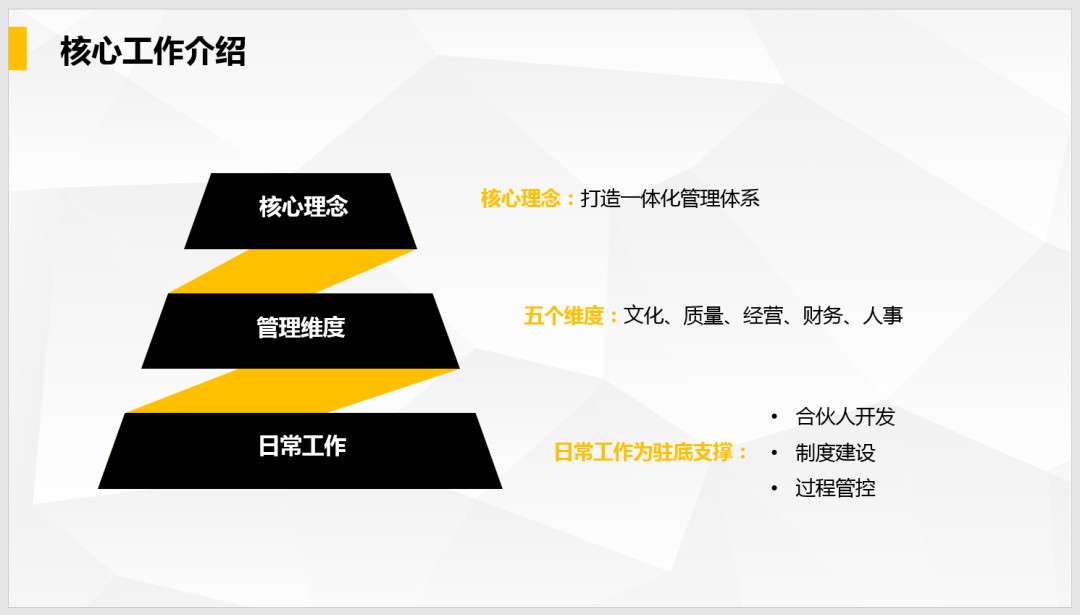 4、合伙人管理部:即將推進合伙人風控工作組工作,梳理總結,識別分析,從質量成果、檔案用印、財務管理、稅務籌劃等方面入手,加強安全合規(guī)管理。