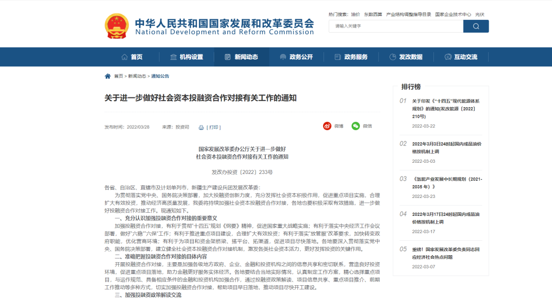 3月28日,國家發展改革委辦公廳印發《關于進一步做好社會資本投融資合作對接有關工作的通知》(以下簡稱《通知》),部署各地積極采取有效措施,進一步做好投融資合作對接工作。