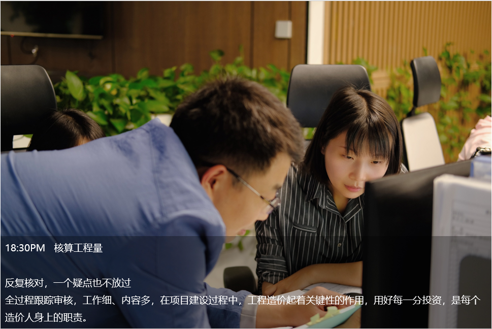 晚上7點,造價部同事還在計算工程量。內墻工程量是不是漏算了?混凝土類型是不是用錯了?他們邊檢查邊計算,用嚴謹的工作態度,扎實的專業技能,細致的服務理念,一次又一次贏得客戶的信賴。