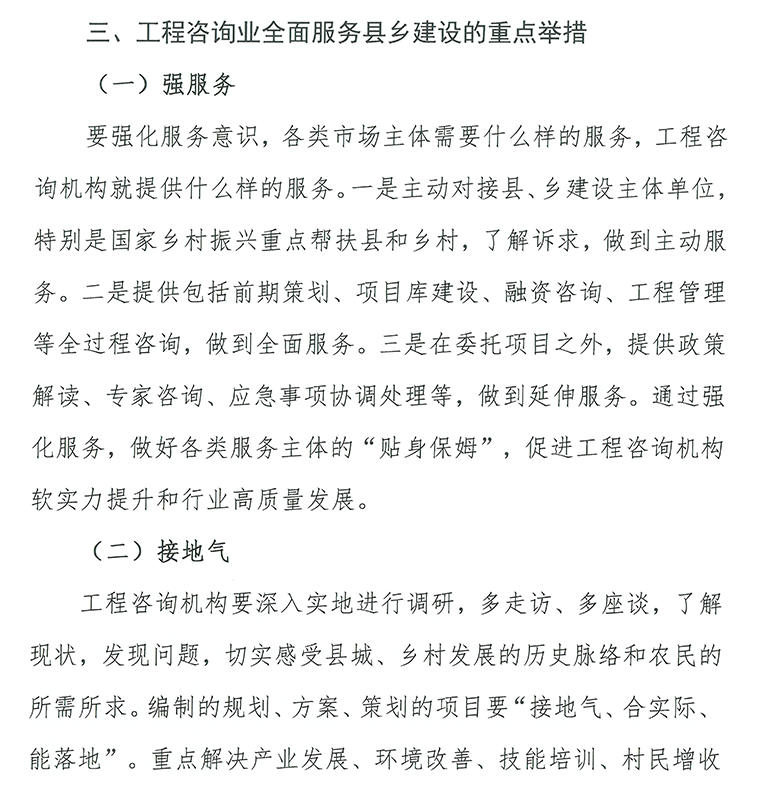 工程咨詢業(yè)是技術(shù)密集、智力密集型行業(yè),要加快實現(xiàn)高質(zhì)量發(fā)展,關(guān)鍵還是“抓人才”。近日中國工程咨詢協(xié)會印發(fā)了《關(guān)于工程咨詢機構(gòu)參與縣城城鎮(zhèn)化建設(shè)、鄉(xiāng)村建設(shè)行動的指導(dǎo)意見》,詳細(xì)闡述了工程咨詢?nèi)嗽趨⑴c縣城城鎮(zhèn)化建設(shè)、鄉(xiāng)村建設(shè)的素質(zhì)提升點和工程咨詢團隊的團隊建設(shè)點。