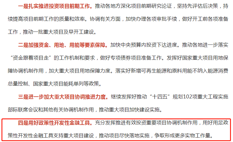 國(guó)常會(huì)提出的政策性、開(kāi)發(fā)性金融工具為項(xiàng)目資本金又增加了一個(gè)新的資金渠道,可以更大程度的撬動(dòng)市場(chǎng)資金,引導(dǎo)金融機(jī)構(gòu)加大配套融資支持,吸引民間資本參與。目前各省市正積極推進(jìn)政策性、開(kāi)發(fā)性金融工具項(xiàng)目申報(bào)組織和資金投發(fā)等工作,持續(xù)提升地方金融治理能力,優(yōu)化區(qū)域金融創(chuàng)新結(jié)構(gòu),從而不斷激活金融資源流入,促進(jìn)基礎(chǔ)設(shè)施投資、助力重大項(xiàng)目建設(shè)。