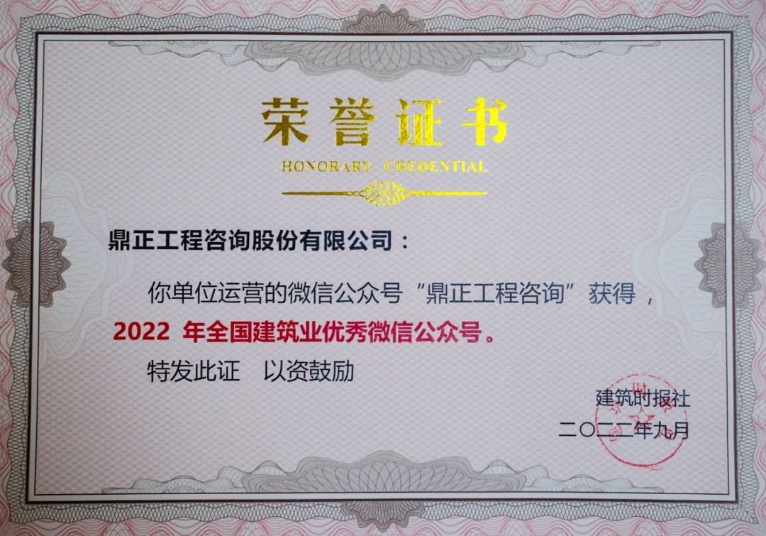 9月25-26日,由建筑時報社主辦的2022建筑業微信公眾號運維經驗交流研討會暨全國建筑業優秀公眾號頒獎典禮在武漢舉辦。鼎正官方微信公眾號“鼎正工程咨詢”上榜國建筑業優秀微信公眾號榜單,榮獲2022年全國建筑業優秀微信公眾號