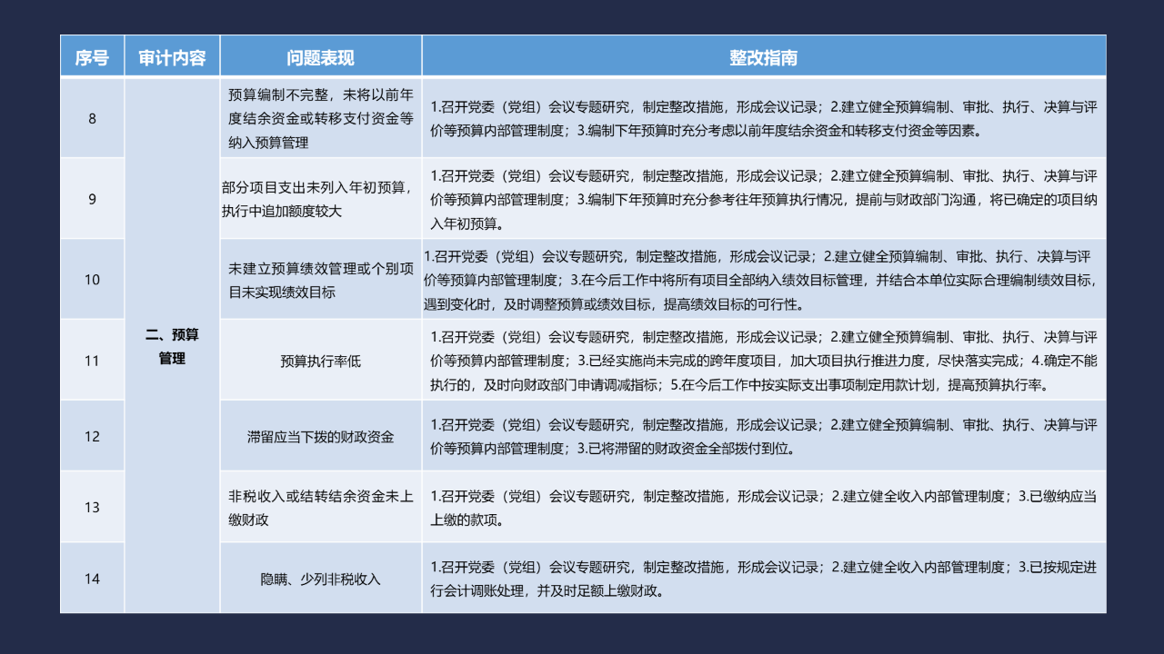 《整改指南100條》僅對審計整改的認定提供一般參考,每個問題的具體整改要求由審計機關在此基礎上依據審計事實、問題情節、產生后果,在審計報告及所附的《審計發現問題清單》中予以明確。涉及上級審計查出問題的整改情況按照上級審計機關有關要求進行落實。