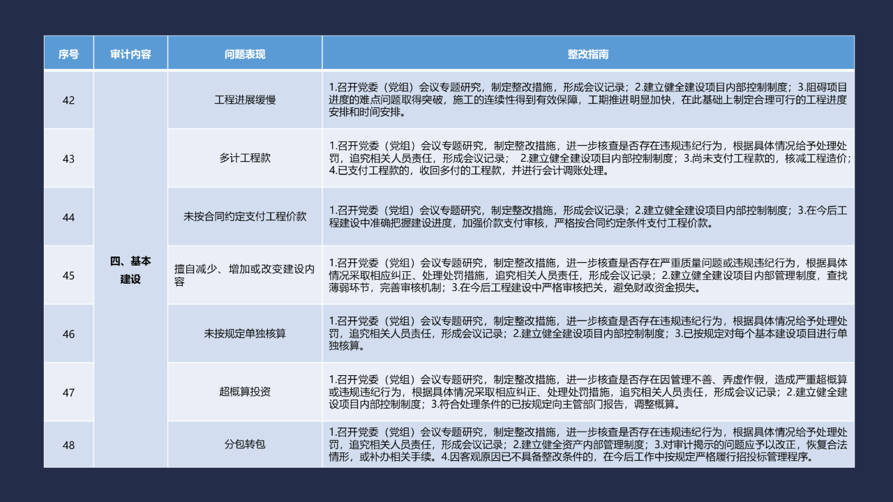 《整改指南100條》按照常見的重大政策措施落實、預算管理、政府采購及招投標、基本建設、內控管理、企業管理、自然資源、社保資金及安居工程、金融管理、國外貸援款共10類審計內容進行問題分類,列舉了100個常見問題并給出相對應的整改方法說明,供審計機關和整改責任單位在審計整改工作中參照落實。