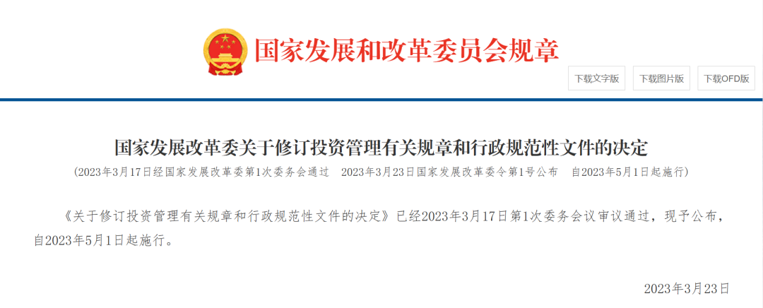 國家發改委《關于修訂投資管理有關規章和行政規范性文件的決定》自2023年5月1日施行!