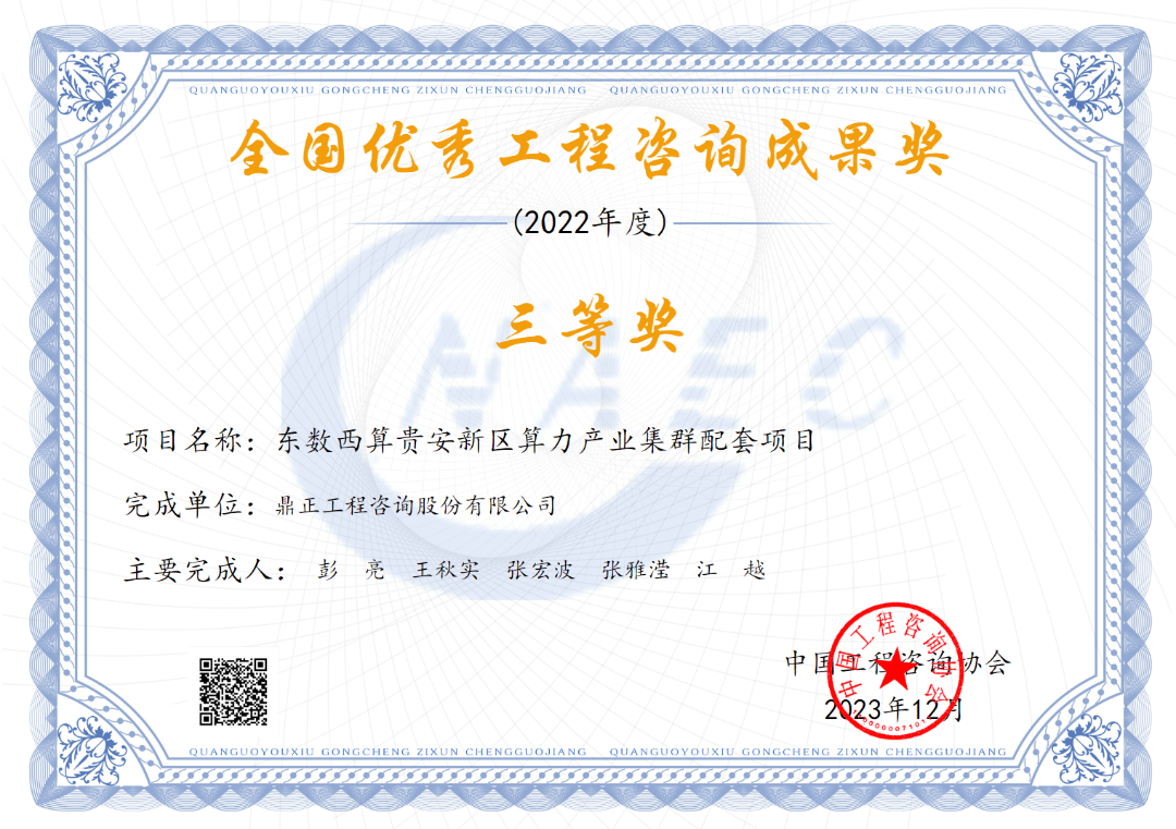 2023年12月29日,中國工程咨詢協會公布了“2022年度全國優秀工程咨詢成果獎”獲獎項目名單,鼎正咨詢編制的《東數西算貴安新區算力立業集群配套項目》榮獲全國優秀工程咨詢成果三等獎。