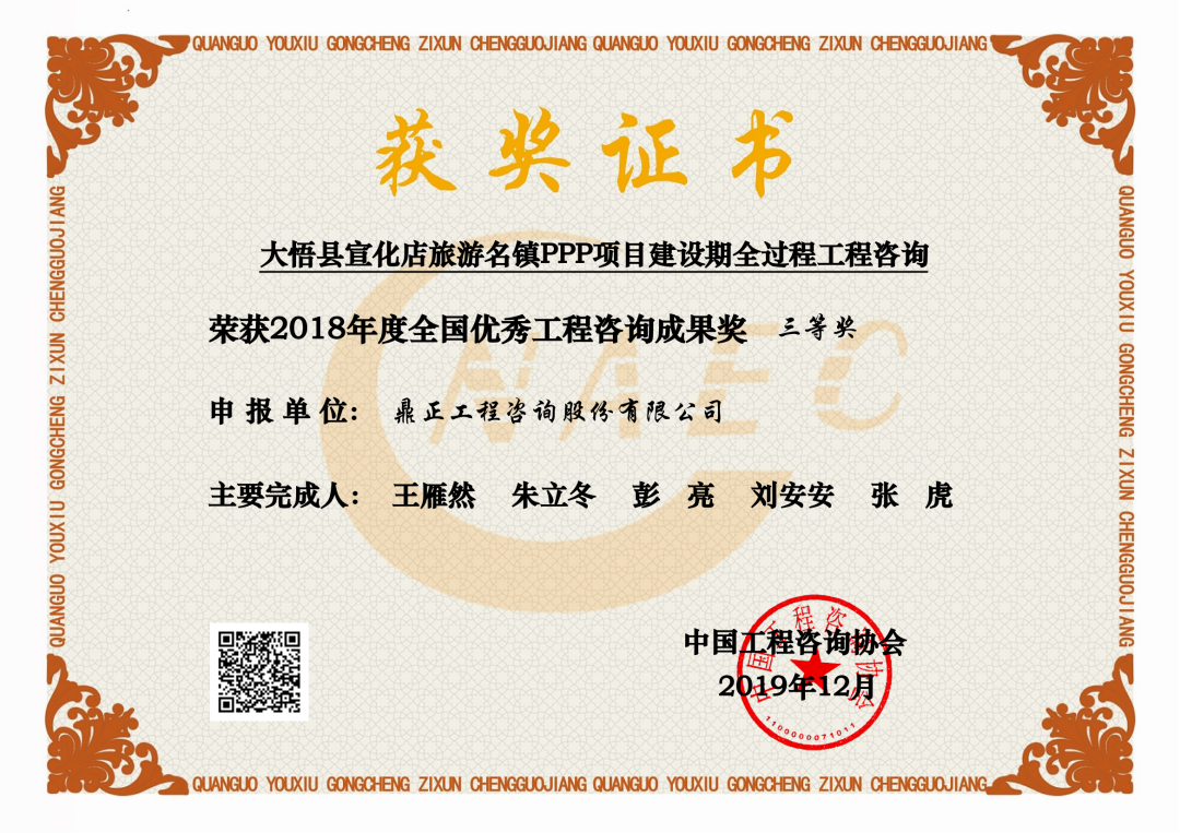 每兩年評選一次,2018-2019年,我司大悟縣宣化店旅游名鎮建設PPP項目首獲“全國優秀工程咨詢成果獎”榮譽;2020-2021年,我司武漢市江夏區清水入江PPP項目再獲該獎;2022-2023年,我司東數西算貴安新區算力立業集群配套項目第三次獲得此殊榮。