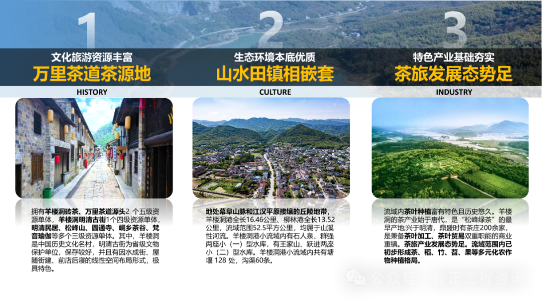 以本項目為例,羊樓洞港小流域地處幕阜山脈和江漢平原接壤的丘陵地帶,流域內有羊樓洞港、柳林港兩條水系,整體呈現(xiàn)山、水、田、鎮(zhèn)相嵌套的格局;流域內擁有明清時期國際茶葉貿(mào)易名鎮(zhèn)——羊樓洞古鎮(zhèn),這里是歐亞萬里茶道的源頭;流域內茶葉種植特色歷史悠久,茶旅產(chǎn)業(yè)發(fā)展態(tài)勢正足,并且已初步形成茶、稻、竹、芍、果等多元化農(nóng)作物種植格局。