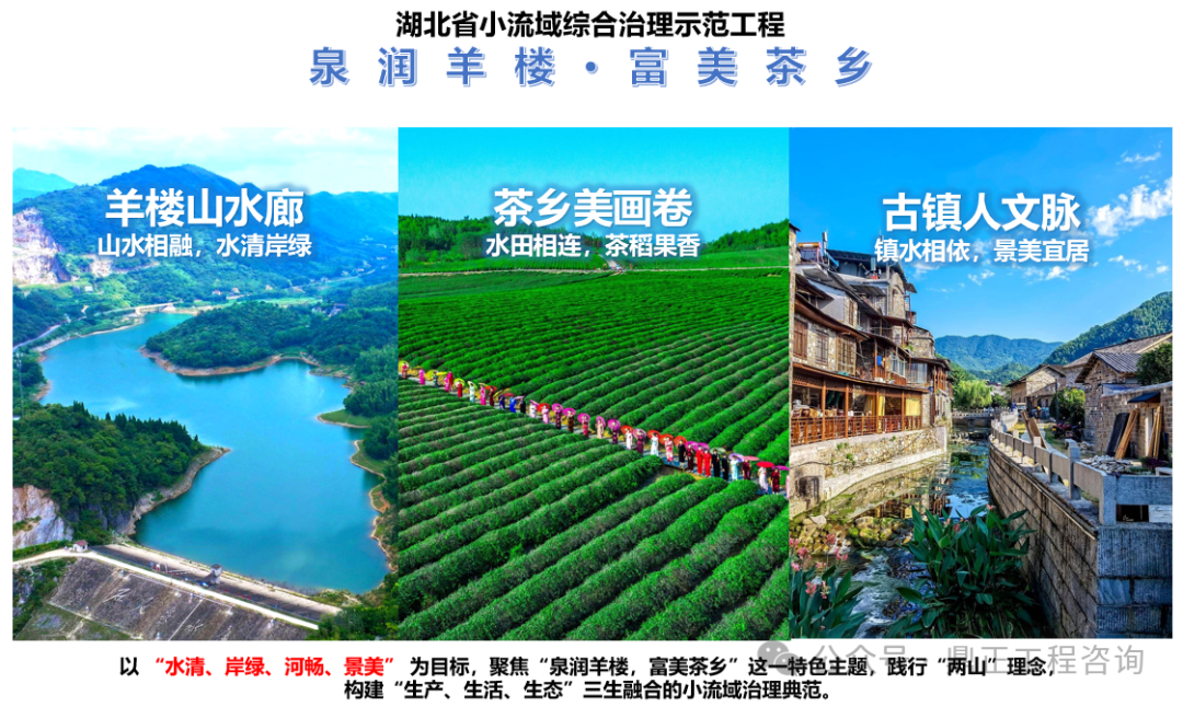 以本項目為例,設計提出以 “水清、岸綠、河暢、景美” 為目標,聚焦“泉潤羊樓,富美茶鄉(xiāng)”這一特色主題,踐行“兩山”理念,構建“生產(chǎn)、生活、生態(tài)”三生融合的小流域治理典范。