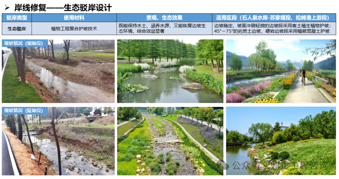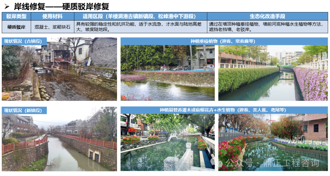 生態(tài)方面,打造“羊樓生態(tài)廊”,以水提質,修復流域生態(tài),即實施一批駁岸整治、水質提升、生境構建等河道治理措施進行水岸共治。針對水生態(tài)的修復,根據(jù)不同水體類型提出技術方式;對于岸線的修復,又針對不同的駁岸類型提出適用的整治措施。