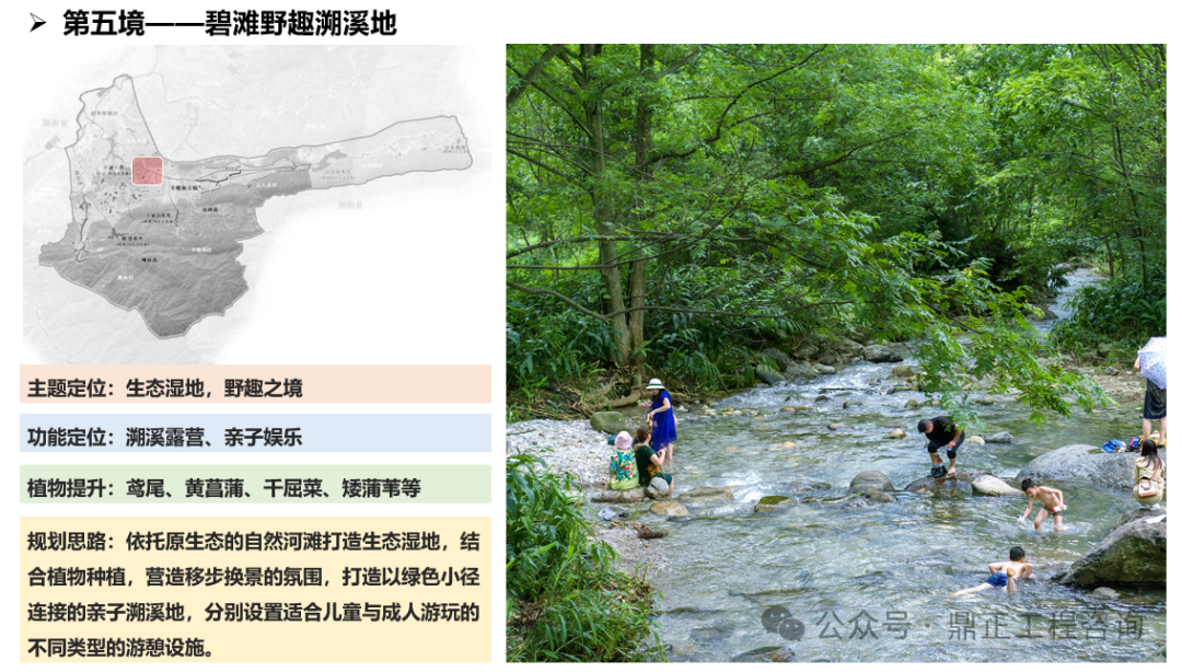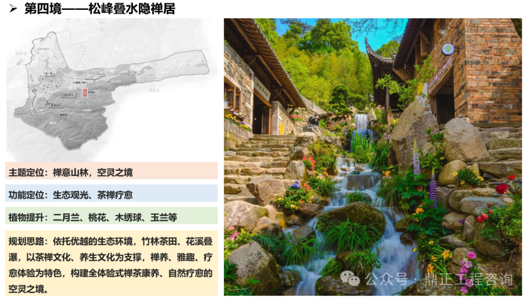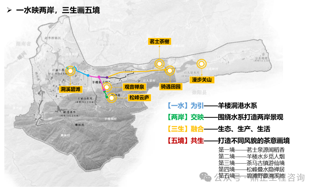 一水為引,指出治理對象,即羊樓洞港小流域;兩岸交映,指出治理范圍,即包括上下游、左右岸、堤內外;三生融合,指出治理路徑,即走好生產(chǎn)、生活、生態(tài)協(xié)調發(fā)展之路;五境共生,即為五個治理分區(qū),通過分段體現(xiàn)差異化分區(qū)的理念,以線帶面也利于實施過程中分期分段逐步推進。每個分區(qū)都有具體的功能定位、治理目標、治理標準,因此不同分區(qū)名稱就是該區(qū)治理特色的高度凝練,既要體現(xiàn)水系的區(qū)位,如“茗士泉源”對應相公泉,“茶馬古鎮(zhèn)”對應羊樓洞古鎮(zhèn),“松峰”對應松峰山;也要體現(xiàn)水系的形態(tài),如“泉”、“溪”、“疊水”等;還要體現(xiàn)水系的功能,如“稻香”對應田園塘渠,“水鄉(xiāng)”對應生活河道,“碧灘”對應生態(tài)濕地等。
