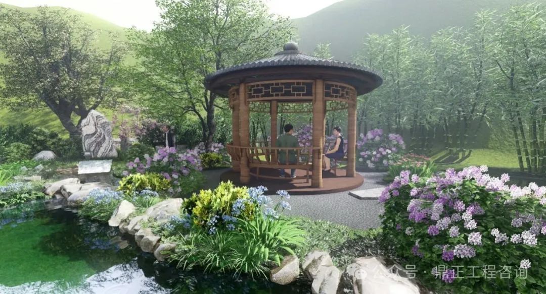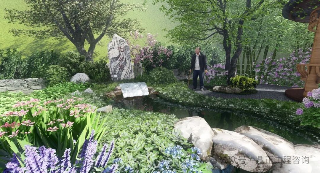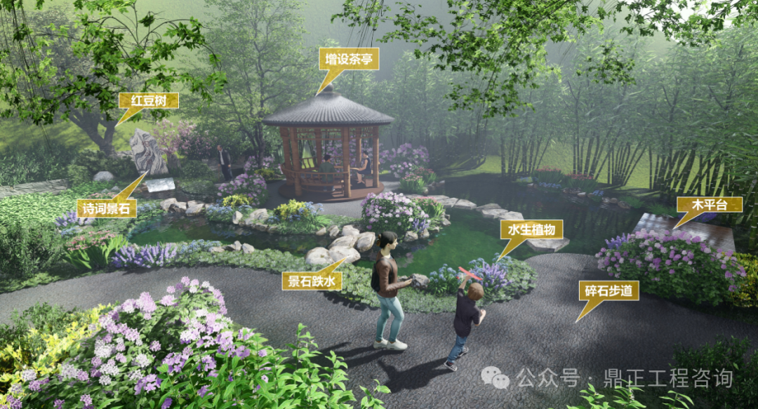 水景觀水文化打造:通過深挖相公泉歷史文化內涵,進行本地印象提煉?!跋喙币辉~在古代,是妻子對丈夫的稱呼,也是君子、生員(秀才、相公)、宰相的另一種叫法。君子愛茶,沏茶品茗,修煉品性,以茶可雅志,茶是象征著塵世的純潔。設計從自然山水出發(fā),落位于閑情逸致設計基調,泉眼處采用題字景石配上一棵姿態(tài)旖旎的紅豆,視線端頭一幅竹影錦鯉、花木跌水的畫面映入眼簾,兩側的樹木林立,開合有致,整個節(jié)點的中心是一座圓頂茶亭,在亭中,一壺清茶問道,仿佛拉近了古今往事,也增加了場地的記憶,呈現(xiàn)出 “千年古樹頻招手,萬年清泉溢清香”的意境。