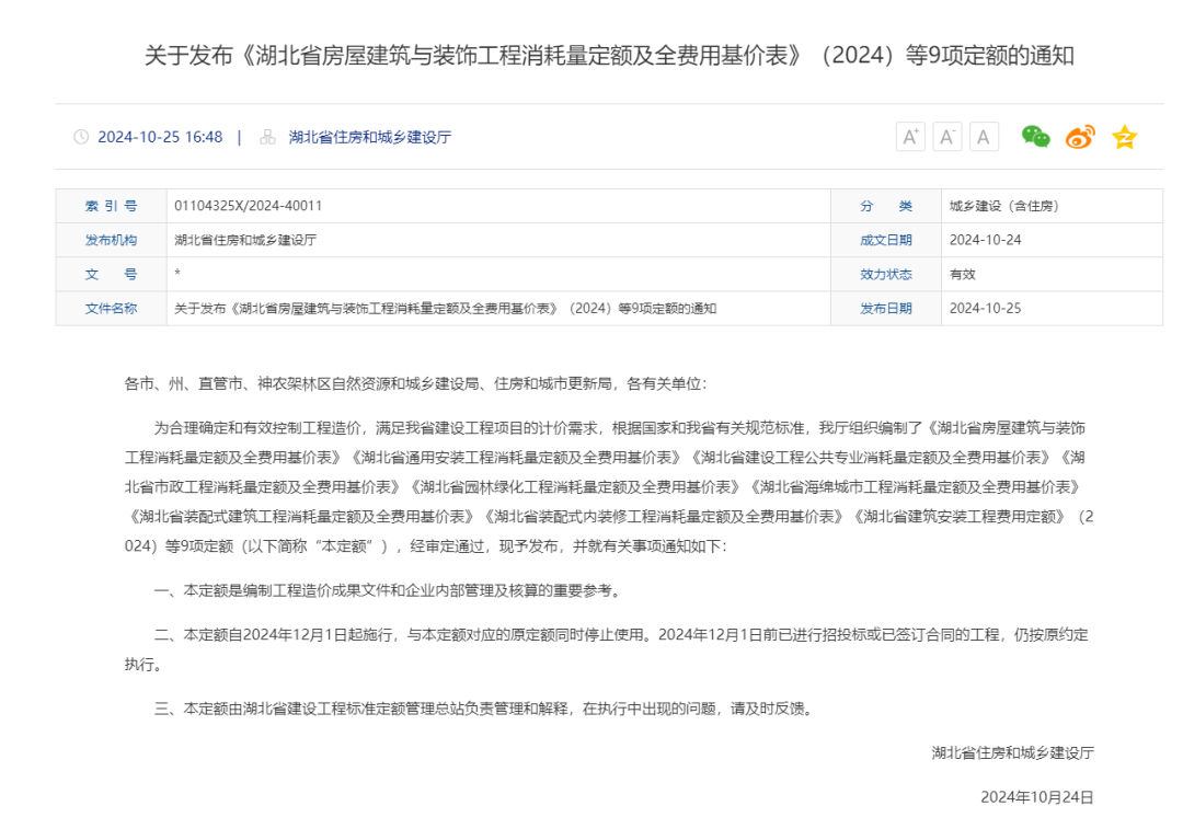 ▲《湖北省房屋建筑與裝飾工程消耗量定額及全費用基價表》(2024)等9項定額正式發布