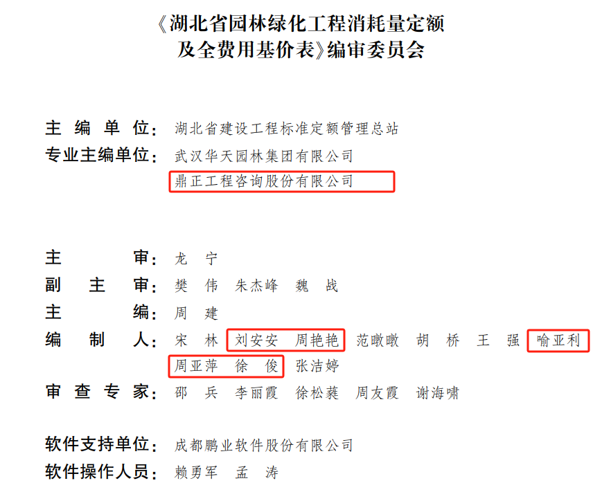鼎正作為《湖北省園林綠化工程消耗量定額及全費用基價表》《湖北省建筑安裝工程費用定額》的參編單位之一,充分發揮全過程工程咨詢資源集中的優勢,為此次定額的修訂貢獻了鼎正在全過程工程咨詢、工程造價咨詢業務領域編審設計概算、投資估算、工程預算、過程結算、竣工結算等實踐經驗,對進一步完善工程造價計價依據體系提供了有力的技術支撐。