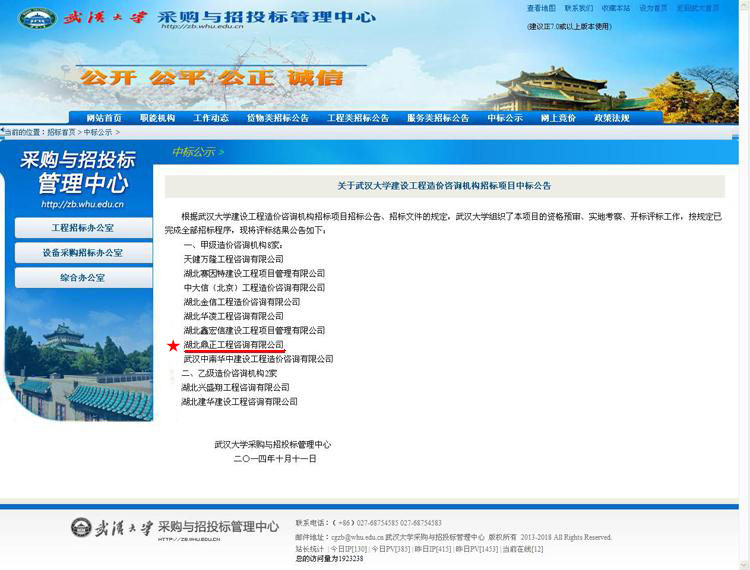 我公司入圍武漢大學建設工程造價咨詢機構信息庫,此次遴選面向全國工程造價咨詢企業進行招標,共入圍10家企業,主要為武漢大學提供建設工程項目工程量清單與招標控制價編制與審核、全過程造價控制、竣工結算審核等相關服務。