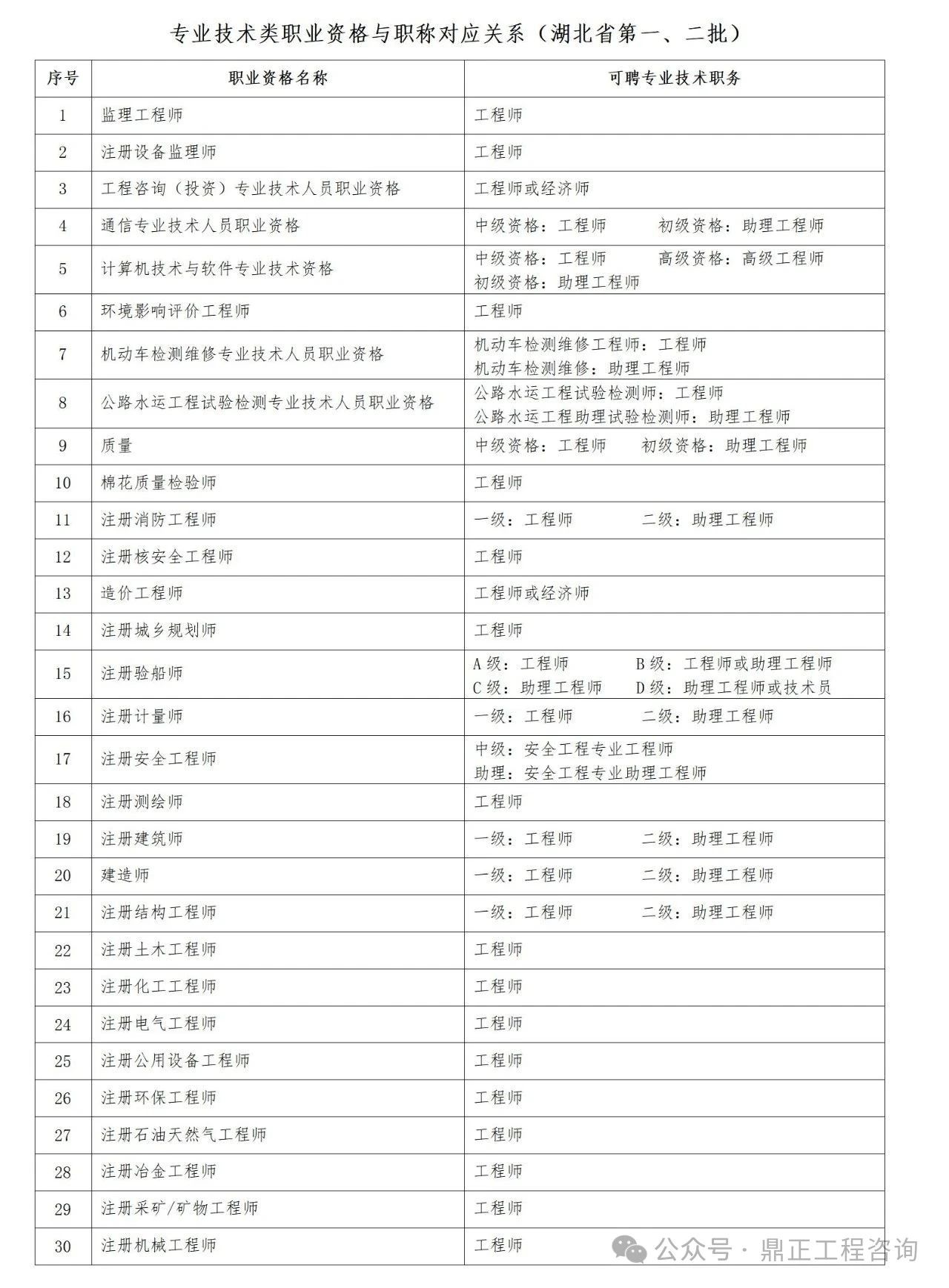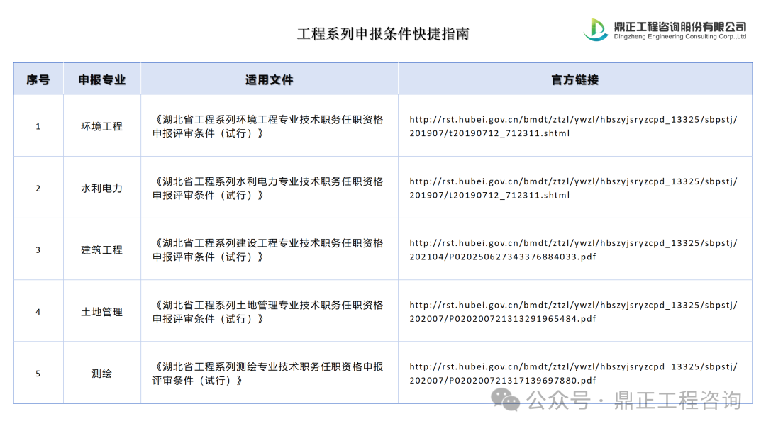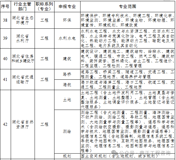 鄂職改辦已下發《湖北省職稱評審專業目錄》(鄂職改辦〔2021〕46號),其中工程系列已涵蓋環保、水利水電、建筑、土地、測繪、規劃等相關專業,詳見下圖: