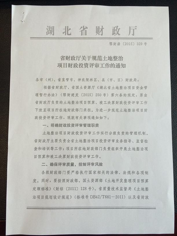 湖北省財政廳關于規范土地整治項目財政投資評審工作的通知