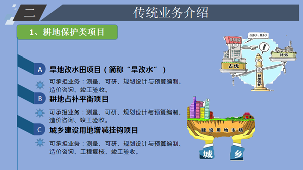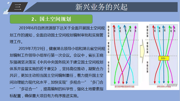 下午,來自自然資源事業(yè)部的胡小虎進(jìn)行了《新形勢下的自然資源咨詢業(yè)務(wù)探析》的主題分享。胡小虎結(jié)合2018年3月自然資源部、農(nóng)業(yè)農(nóng)村部組建成立的背景,對自然資源傳統(tǒng)業(yè)務(wù)、新興業(yè)務(wù)的興起做出了詳細(xì)介紹,并從“客戶基本信息分析”、“客戶采購項(xiàng)目分析”、“市場分析”、“從業(yè)單位分析”、“擬拓展方向”五個(gè)方面對自然資源咨詢業(yè)務(wù)進(jìn)行了分析。
